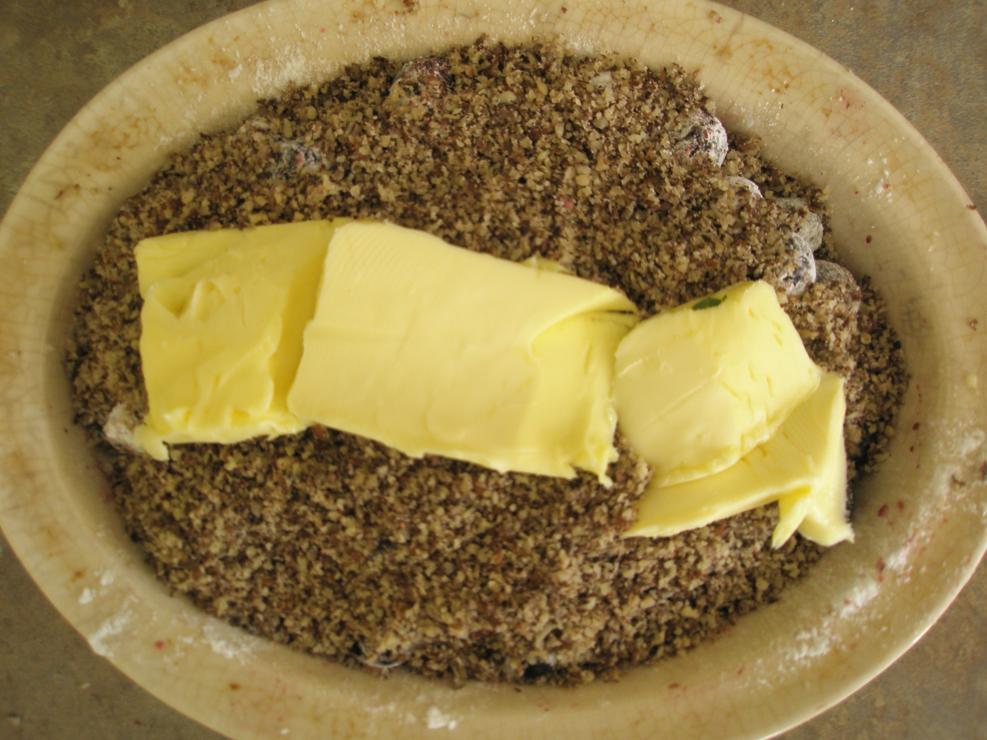 Coat the top of the dish with your nut meal and a pinch of sea salt.  Layer the top with pastured butter or ghee.