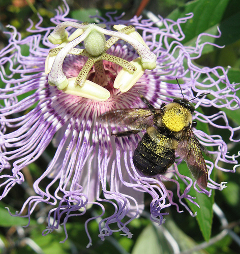 The last collaborator I want to mention is the carpenter bee, whose large, fuzzy body is one of the key pollinators for this flowering vine. The nectar is at the base of the sexual organs of the flower. The stamen (or male parts of the plant) reach over their pollen-dusted tips like miniature shower-heads, of which carpenter bees can’t resist clumsily rubbing up against as they sip on nectar.