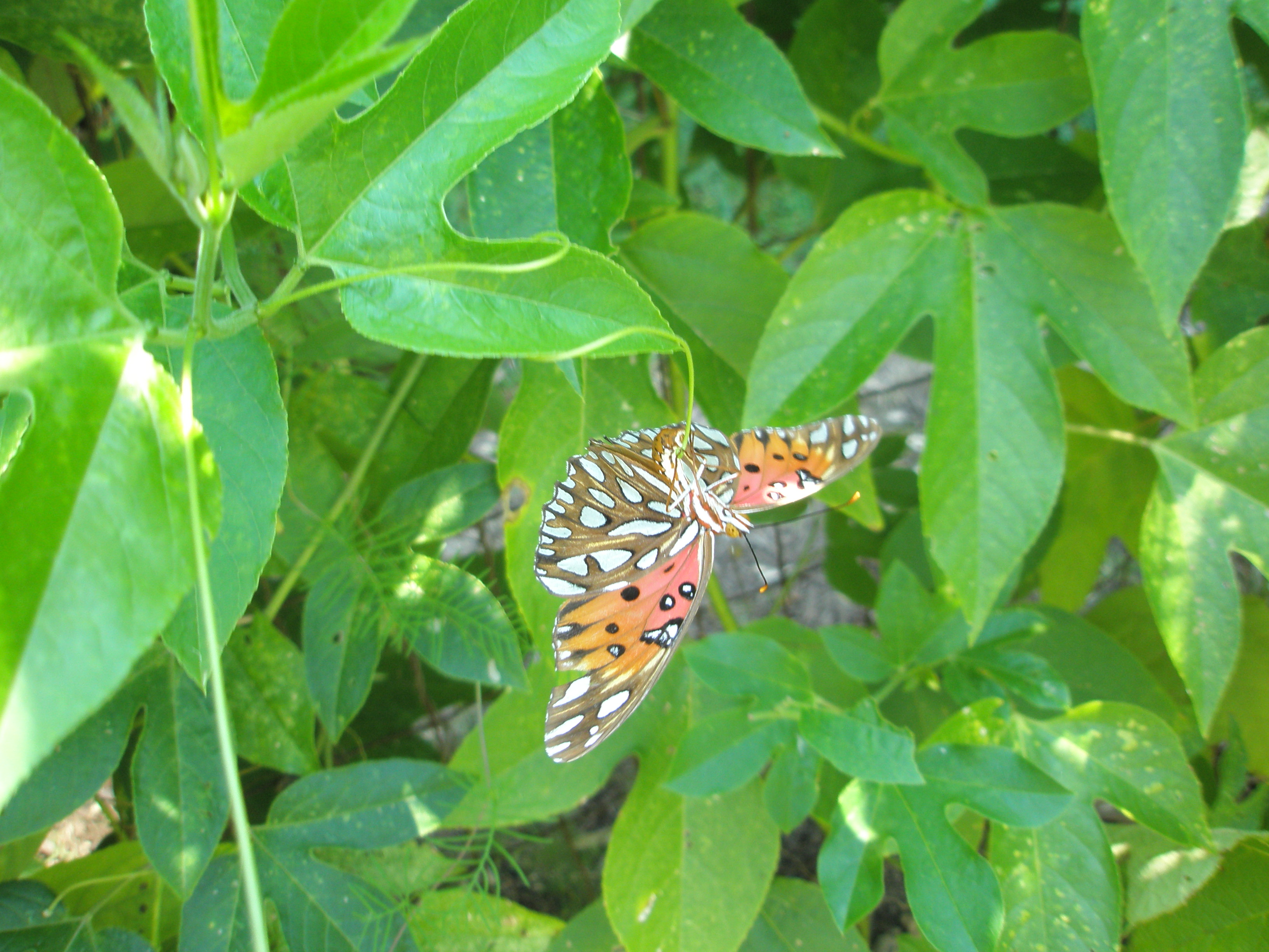 The gulf fritillary butterfly caterpillar’s *only* food source are passionflower leaves, so these two beings are intimately linked. And, gulf fritillary butterflies are always seen dancing around the vine once they are winged and in flight to lay eggs. Their silver-streaked underbellies are simply amazing!