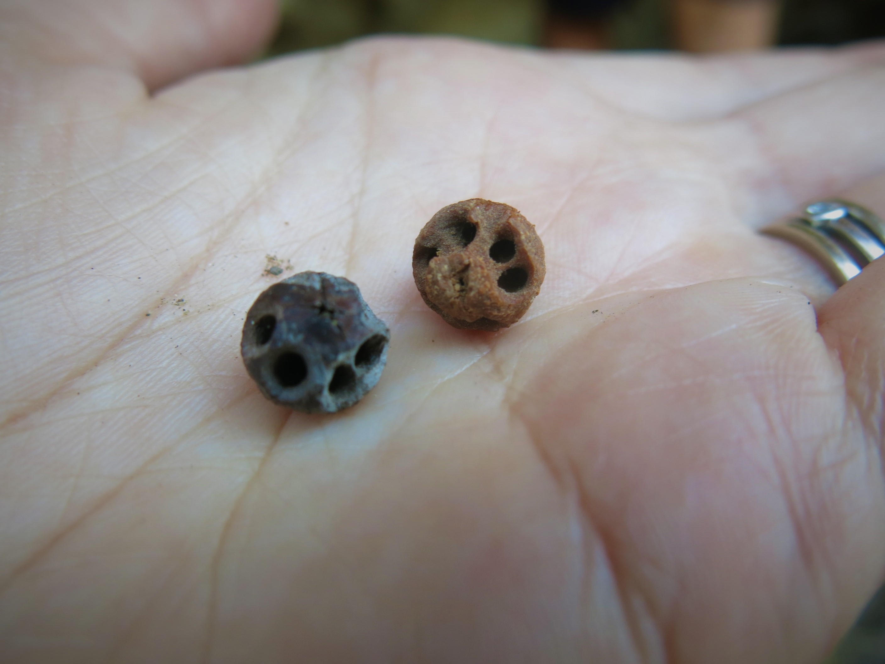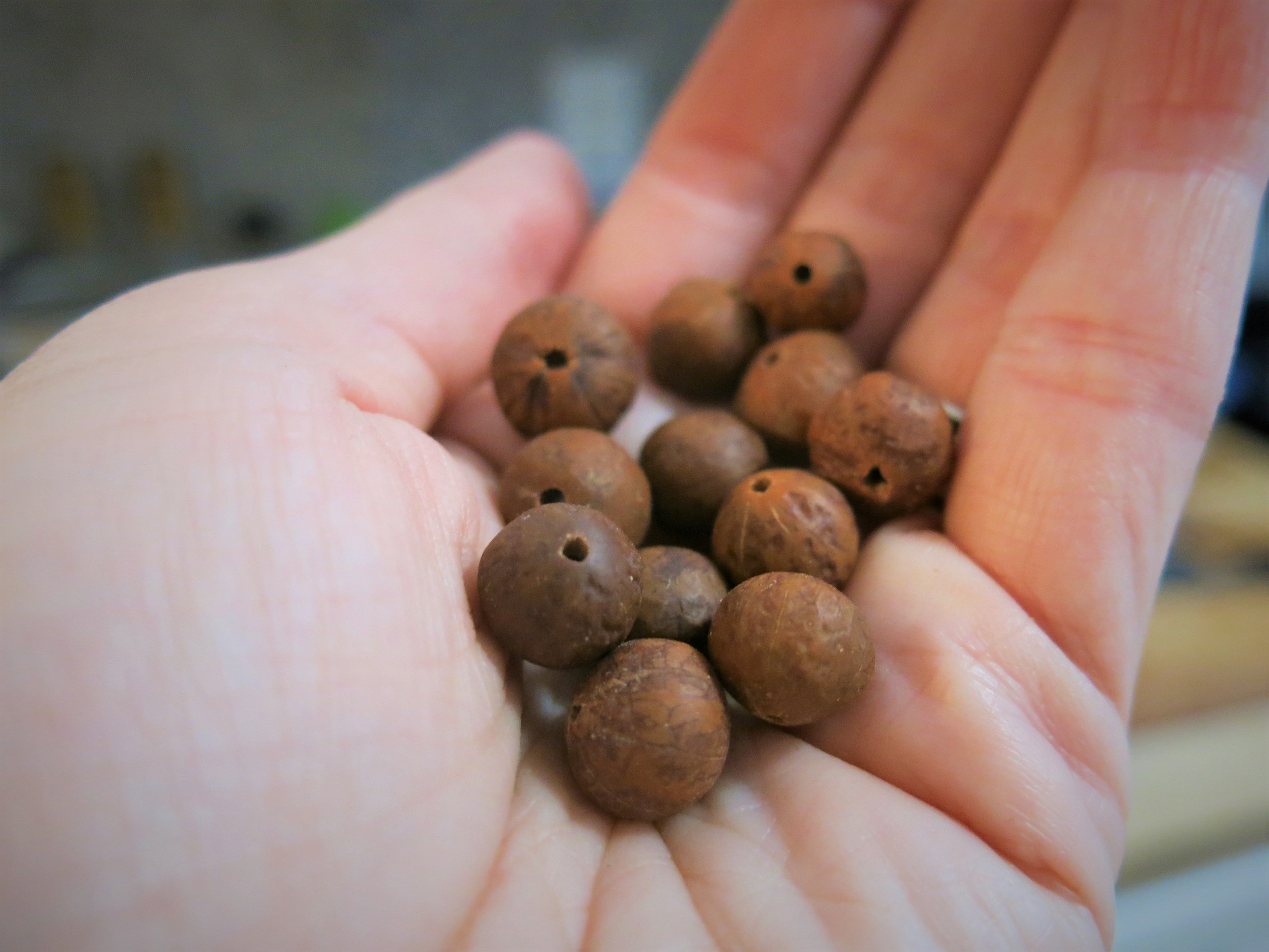 I talked to a local herbalist about these large, curious seeds and he mentioned that the local First Peoples (the Chumash) would drill holes in the seeds to make necklaces and to do other bead work. Right after I found out about that, my friend had received a gift of a necklace with manzanita big-berry seeds and some polished cross sections of its branches.