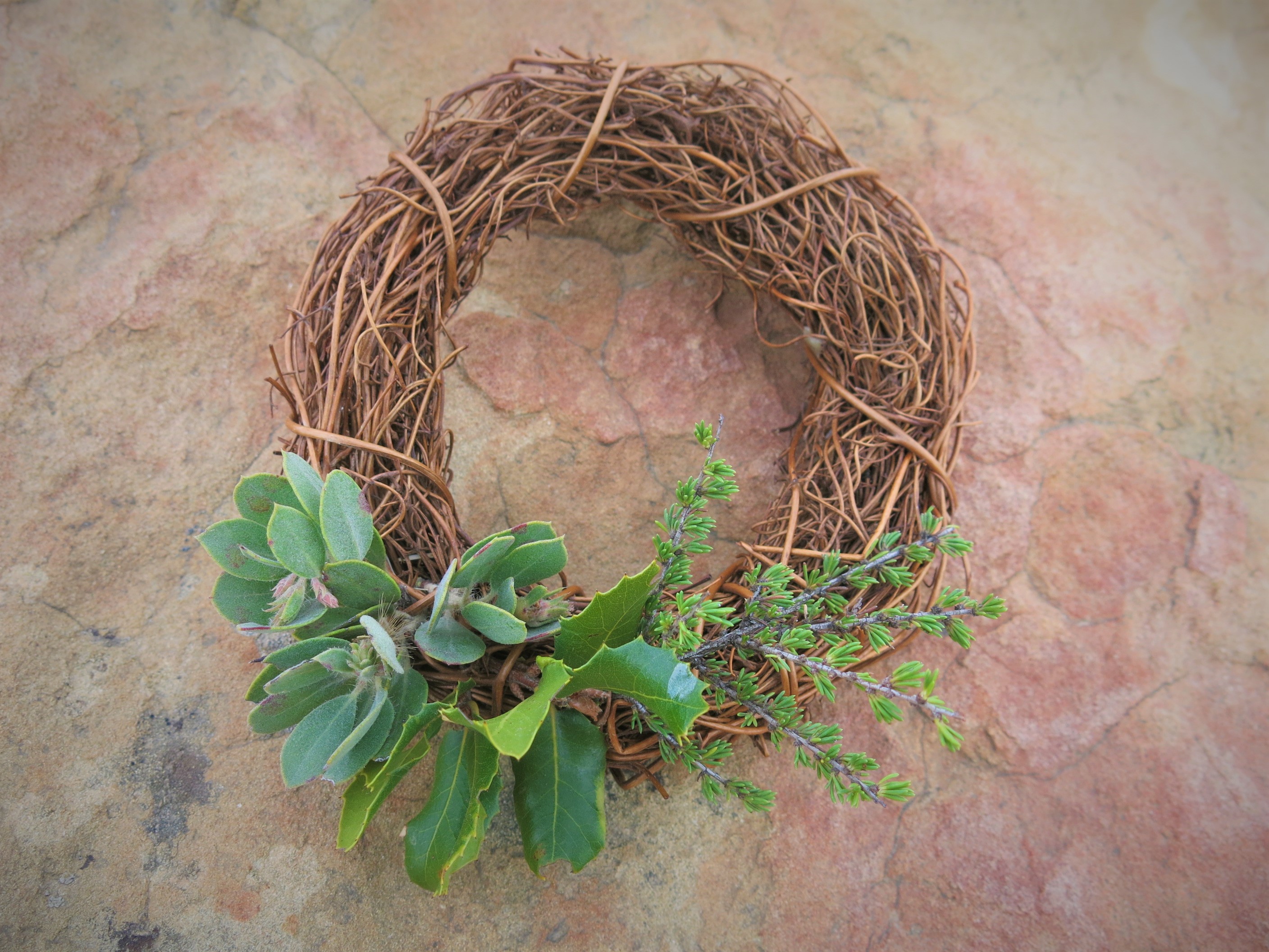 From top left to bottom: a hardy flower gone to seed, growing out of lichen-softened sandstone; a wasp gal, already cracked open; a wreath I added manzanita, oak, and chamise to; an interesting root burl of manzanita found climbing a rock (it really looked like a goat spirit); lichen