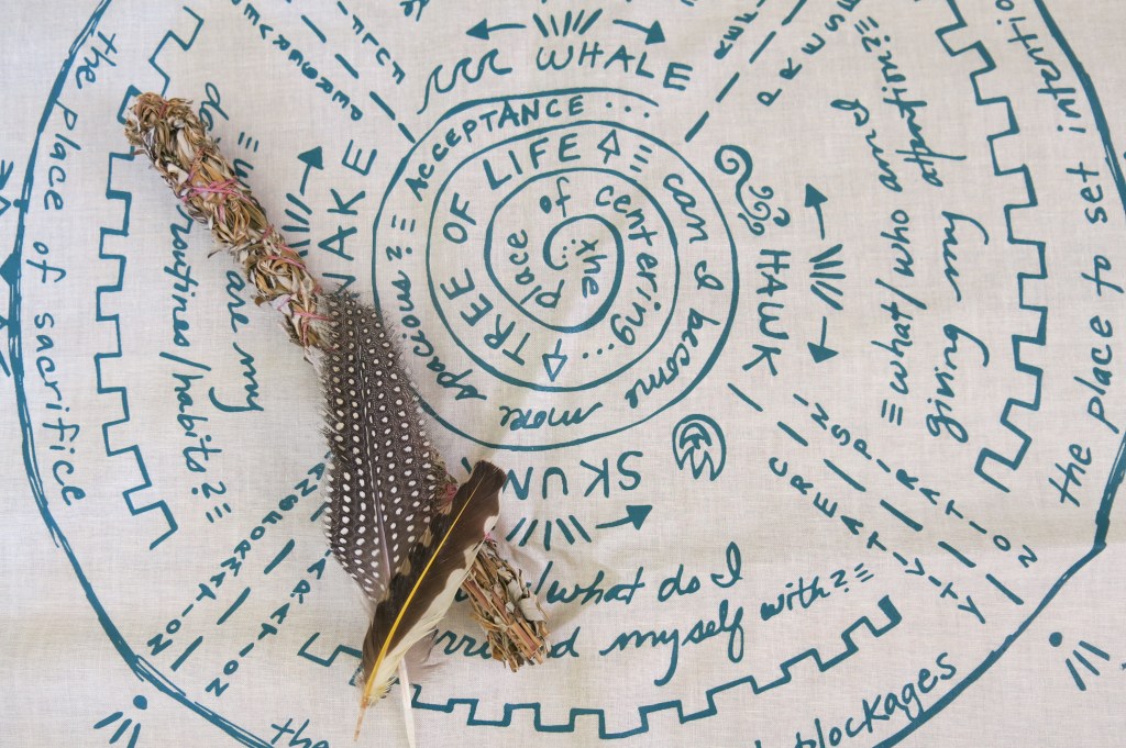 “Everyday seems more powerful now as I can see the directions of the wheel vividly, with myself at the center, bringing my attention always back to my own breath, my own outstretched physical body, my spiritual and psychic self. It helps ground me to what matters most, my power and agency to understand and be with my own truths, the truths of others, my feelings about those truths. It radiates outwards from my core to connect with others, past present and future, the simple map that in all ways, brings me to recognize the illusion of separation. I hope to carry this gift with me and continue to grow and learn from it. I hope it continues to unlock things for me in my spiritual, mental, and physical life as I make my way around it again and again each year.”