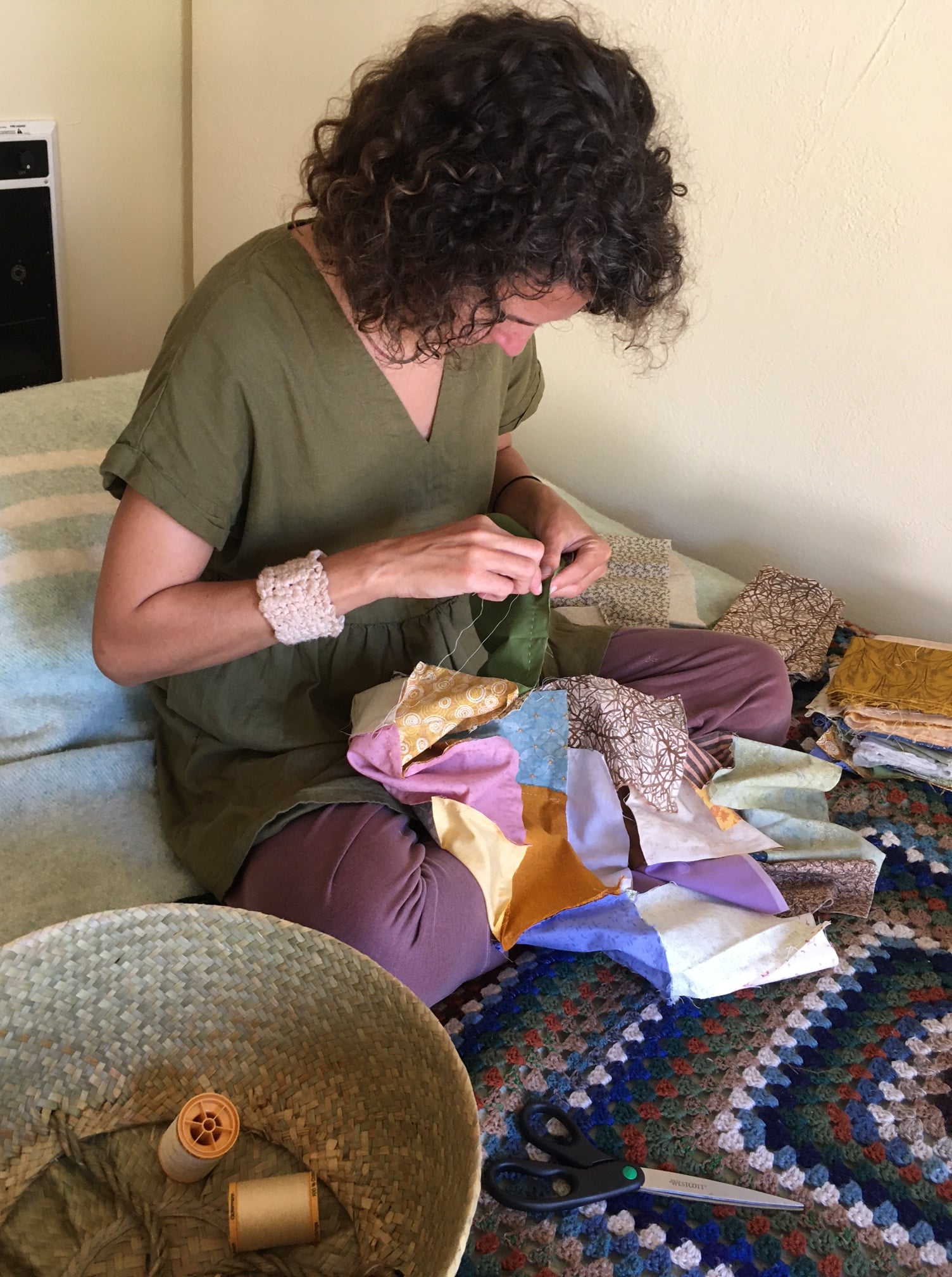 Most pieces of fabric were from the quilter’s scrap sale, but some came from some things of my daughter’s and fabric from the times were were in (a piece of fabric we had both contributed stitches to, an indigo dyed fabric from a cloth mask a friend had made my daughter for *pandemic times*, fabric scrap from making dinner napkins, and a piece of an avocado pit dyed dress my daughter used to wear).