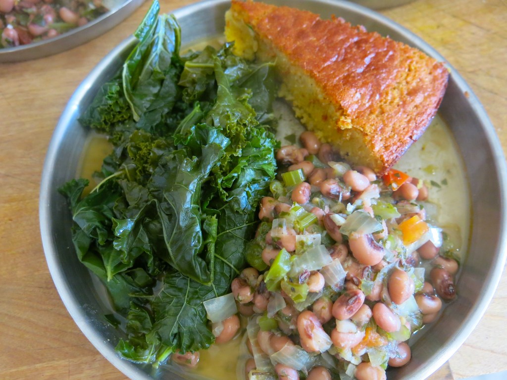 I definitely put my spin on things…but the baseline recipes are traditional and Southern. My mom shared with me her favorite black eyed pea recipe (see below and I didn’t use pig tails, by the way), and boiled greens recipes from Edna Lewis’s cookbook. I used my favorite cornbread recipe (at the very end of this post).